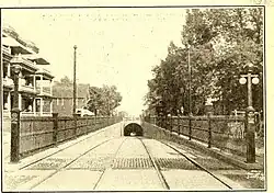 The 16% grade on the hill towards Selby Avenue from downtown was difficult for streetcars to climb. A complex system of counterweights helped streetcars travel up the hill.[8] The Twin City Rapid Transit Company built a 1,500 foot tunnel that changed the grade to 7%. The tunnel is 15 feet high and 23 feet across. The tunnel entrance at the base of the hill is still visible and has been sealed closed.[3] Construction of the tunnel significantly decreased travel time and caused a sudden increase in development of the neighborhood along the line.[8]