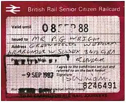 - For four weeks from 8 April 2000, a senior citizen buying a Railcard by telephone could order one free of charge for another person, subject to proof of entitlement being given.[19]