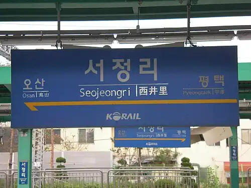 Seojeongni station is a station in Seojeong-dong, Pyeongtaek, South Korea. Mugunghwa-ho trains running on the Gyeongbu Line stop here. Additionally, services on Seoul Subway Line 1 have been calling at this station since 2005. Its station subname is Kookje College (An international college).