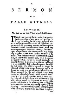 "On False Witness" was given in 1715.[50] Its introductory passage from scripture comes from Exodus 20:16 – "Thou shalt not bear false witness against thy neighbour."[51]