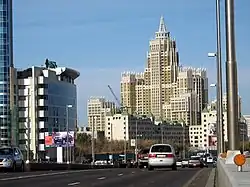 Designed by Mikhail Posokhin (Sr.) and Ashot Mndoyants. 160 metres tall, 22 floors (18 usable in the wings and 22 in the central part). The building is located on the end of Krasnaya Presnya street, facing the Sadovoye Koltso and was primarily built as high-end apartments for Soviet cultural leaders rather than politicians.