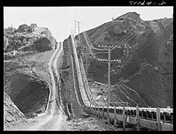 In November 1938, construction started on a diversion channel that would shunt water to the east (left) side of the river so the foundations could be laid on the west side. The left bank of the river was widened and deepened using explosives, and a cofferdam was built to dry up the bypassed section.[29] To supply sand and gravel to make concrete at the construction site, Pacific Constructors built the largest conveyor belt system in the world,[18] 9.5 miles (15.3 km) long, that reached from Redding to the dam site. This was capable of transporting 1,100 tons of material per hour, and over the entire construction process, hauled more than 12 million tons of rock.[30] The belt, which had some 16,000 rollers, was divided into 26 sections, 23 of which were powered by individual 200 horsepower (150 kW) motors. The remaining three were downhill and did not require power; in fact they were retrofitted to generate power for some of the other sections.[31]
