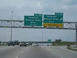 Shawnee Mission Parkway is a stretch of roadway in Johnson County, Kansas and Jackson County, Missouri (only a fragment). Its western terminus at K-7 in Shawnee, Kansas and its eastern terminus at Ward Parkway in Kansas City, Missouri. The roadway is signed as US 56 from Interstate 35 to its eastern terminus, with US-69 overlapping from I-35 to Metcalf Avenue, and US-169 overlapping from I-35 to Rainbow Boulevard.