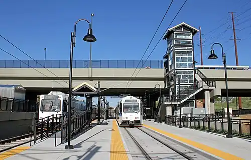 Sheridan station is a below grade light rail station on the W Line of the RTD Rail system. It is located alongside the banks of the Lakewood Gulch under Sheridan Boulevard, after which the station is named.[1] The station straddles the border between Denver and Lakewood, Colorado, but RTD lists the station as being in the city of Denver. A marking etched into the platform indicates the border location.