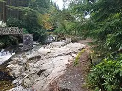 The bedrock of the upper part of the river, located in the Mourne Mountains, is composed of granite formed approximately 50 million years ago (mya).[5] The bedrock of the river as it flows through Tollymore is shale from the Silurian age, more than 400 mya, and it forms step gorges along some sections of the river banks. Dark bands of basalt are found were molten basalt lava was forced through cracks in the bedrock about 60 million years ago. The river bed contains stones and gravel from as far away as Scotland and counties Antrim and Tyrone, which were carried there by glacial ice sheets during the last ice age.[6]