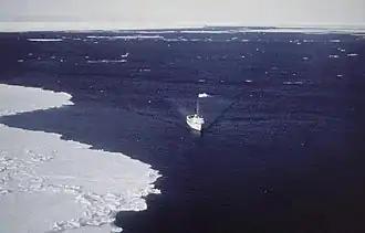 A shore lead (or coastal lead) is an oceanographic term for a waterway opening between pack ice and shore. While the gap of water[1] may be as narrow as a tide crack if closed by wind or currents, it can be as wide as 1,000 feet (300 m).[2] Its formation can be influenced by tidal action, or subsurface conditions, such as current and ocean floor.[2] Commonly, a shore lead is navigable by surface vessels.[3]
