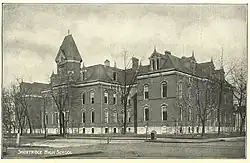 Abraham C. Shortridge was recruited to become school superintendent in 1863. Shortridge was a strict educator when it came to drilling students and faculty alike. However, he was also innovative in many ways, including the hiring of female teachers and the admission of African-American students.[5] Sarah D. Allen Oren Haynes, who taught at the high school from 1869 to 1873, later became the first female state librarian of Indiana and the first female professor at Purdue University.[6] By 1878, Shortridge High School served 502 students.[5] Roda Selleck, who began teaching art at the school in the 1880s, soon won acclaim for introducing "craftwork" – leather, pottery, jewelry, and metalwork – to the curriculum,[7] and later developed a line of pottery, "Selridge Pottery", designed by students. She remained at the school until her death in 1924.[8]