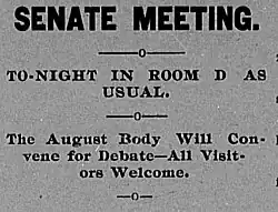The Shortridge Senate was created in 1887 by Laura Donnan.[12] High school juniors and seniors would meet at 2:30 every Friday afternoon. The senate was created in order to teach students about public speaking and politics. Based on the annual Shortridge yearbook of 1918,[13] the talking points included: daylight saving time, workmen's compensation, women's suffrage, amendments to abolish jury trials, eight-hour law, the metric system, and many others.