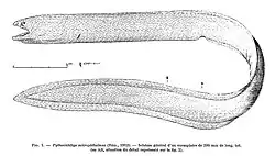 The shorttailed shortfaced eel[2] (Pythonichthys microphthalmus) is an eel in the family Heterenchelyidae (mud eels).[3] It was described by Charles Tate Regan in 1912, originally under the genus Heterenchelys.[4] It is a tropical, marine eel which is known from Mauritania to Angola, in the eastern Atlantic Ocean. It typically dwells at a depth range of 40โ150 metres. Males can reach a maximum total length of 50.5 centimetres.[3]