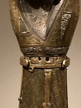 The Shrine of Saint Lachtin's Arm (known in Irish as Lámh Lachtaín[2]) is an early 10th-century Irish arm-shrine type reliquary made of wood and metal shaped as an outstretched forearm and clenched fist.[3] St. Lachtin's dates to between 1118 and 1121 and is associated with his church in the village of Stuake, Donoughmore, County Cork, but probably originates from Kilnamartyra, also in Cork. It consists of a yew-wood core lined with decorated bronze and silver plates. The wood at the hand is hollowed out to create a reliquary cavity which once held the arm bone of St. Lachtin (b. 526, County Cork), but is now empty.[3] The circular cap at its base contains a large transparent gemstone and is inlayed with silver decorated with filigree.