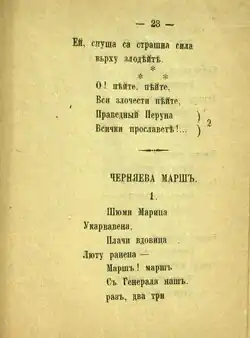 The "Chernyaev March" was first published in 1877 in the newspaper Sekidnevni Novinar by S.P. Bobekov, and then in 1878 in the album Gusla i pesni.[6]