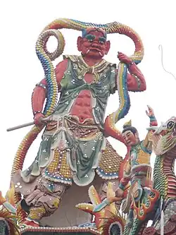 Shunfeng'er is most often portrayed as a demon defeated and tamed or befriended by the sea goddess Mazu. By one account, he and Qianliyan appeared off Meizhou Island during a storm and were defeated by Mazu's magical silk scarf, which blew clouds of sand into their ears and eyes. After their submission, they pledged their loyalty when she kindly healed them of the damage she had caused them.[5] In another, the two were Song generals who competed for her hand at Peach Blossom Mountain (桃花山, Táohuā Shān) but were both defeated by her kung fu.[16] In another, the two were the brothers Gao Jue and Gao Ming. Ruthless generals, they fell at Peach Blossom Mountain and subsequently haunted it as demons. They appeared to Mazu when she traveled nearby and challenged her to battle, with the loser to do the winner's bidding. They intended to have her marry them both but were defeated by her magic and became her servants.[3][7] In still another, the Gao brothers were bandits during the Shang before they began to haunt the mountain.[8]