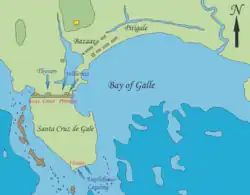 The Portuguese fort of Santa Cruz de Gale was situated on a promontory at the western edge of the Bay of Galle. Although considerably elevated at its southern tip, it gradually sloped down towards the isthmus where it connected with the mainland. At this isthmus, a wall extended from sea side to the bay side enclosing Galle city. There were three bastions defending the wall from sea to bay called "Santo António", "Conception", and "Santiago". Santiago was small and had a low open terrace making it vulnerable to grenade attacks. From the Santiago, a parapet wall ran along the bay up to the Retreat, a fortification that contained the captain's keep and an esplanade, which had space to mount 20 guns.[59]