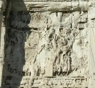 The first panel of the triumphal arch in Rome shows the liberation of Nisibis and the escape of Vologases V (upper right register). | |||||||