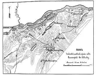 In the garrison of Silistra, there were 30,000 men. 10 days into the siege, on 28 June, a battle occurred with a 7,000-strong force of Çerkes Pasha, who attempted to forcibly lift the siege (see § Battle with Çerkes Pasha's relief force). On 29 June, hearing that Numan Pasha was marching onto Silistra with 20,000 men, Rumyantsev withdrew from Silistra on 29 June without any clashes. - ^ Turkish: Silistre Kuşatması; Russian: Осада Силистрии; Bulgarian: Обсада на Силистра