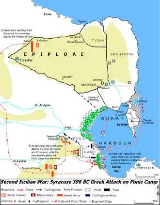 Punic siege of Syracuse 397 BC. Political boundaries and path of troop movement are inexact because of lack of primary source data. | |||||||