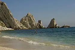 Spiaggia delle Due Sorelle is a beach of white round pebbles which can be seen through the crystal clear water. The name of this beach, which means "two sisters" is due to the twin sea stack raising from the water, which look like two nuns praying.