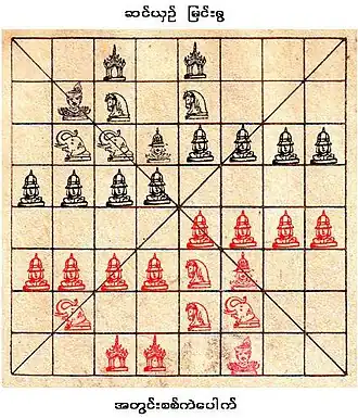 Sittuyin (Burmese: စစ်တုရင်), also known as Burmese chess, is a strategy board game created in Myanmar. It is a direct offspring of the Indian game of chaturanga, which arrived in Myanmar in the 8th century thus it is part of the same family of games such as chess and shogi. Sit is the modern Burmese word for "army" or "war"; the word sittuyin can be translated as "representation of the four characteristics of army"—chariot, elephant, cavalry and infantry.
