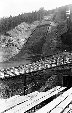 Due to a lack of snowfall before the championships, organizers in Zakopane transported snow from outside the city to artificially cover the hills. This effort proved unnecessary as heavy snowfall occurred days before the events, requiring bulldozers and skiers to remove excess snow to meet the International Ski Federation's specified snow depth standards.[1] The first jumper to test the prepared hill was Stanisław Marusarz, the manager of Wielka Krokiew, who had retired from competitive ski jumping five years earlier. Marusarz achieved a 76-meter jump, earning applause from spectators gathered at the hill.[2]