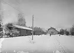 Skoppum was a third-class station, given a more extensive design than many other stations serving rural areas because of its function as a transshipment station between the Vestfold Line and the Horten Line. The station originally consisted of an office for the station master, a ticket office, a waiting room and a restaurant, run by the station master's wife. Next to the station building there was a building for handling cargo. The station also originally contained a locomotive depot, water tower and a turntable. The depot had a place for a single locomotive, which was used on the Horten Line.[8] At the time of the opening the station was staffed by a station mater, two telegraphists and two station workers. The station master lived in the four-room apartment in the upper story of the station building.[9]