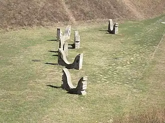The basic elements of the monument are burial mounds, "Gate of Death", "Valley of giving respect" with 12 stone birds and "Valley of the living ones", and amphitheater with a stage and an auditorium.[3]