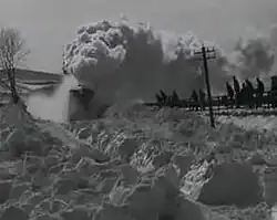 Having dug the engine out of the snowdrift during the night, moving the steam locomotive was another difficult task; when a steam train gets stuck in snow, the heat from its boiler melts the snow around it, but as the boiler cools the melted snow refreezes as ice, meaning that the engine is frozen solid.[2] Workmen had to drape paraffin-soaked rags around the moving parts of the engine and set fire to them to thaw the motion.[2]