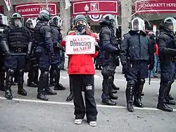 - peaceful movements - various movements which use nonviolent means of protest as part of a campaign of nonviolent resistance, also often called civil resistance. The American Civil Rights Movement, Polish Solidarity movement or the nonviolent, civil disobedience-orientated wing of the Indian independence movement would fall into this category.[36]