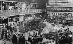 There were other displays elsewhere, each intended to be complete in itself, yet each part of the one single conception.[8] Festival Pleasure Gardens were set up in Battersea, about three miles up river from the South Bank. Heavy engineering was the subject of an Exhibition of Industrial Power in Glasgow. Certain aspects of science, which did not fall within the terms of reference of the South Bank Exhibition, were displayed in South Kensington. Linen technology and science in agriculture were exhibited in "Farm and Factory" in Belfast. A smaller exhibition of the South Bank story was put on in the Festival ship Campania,[3] which toured the coast of Britain throughout the summer of 1951, and on land there was a travelling exhibition of industrial design.[8]