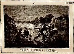 ![]() | "South Carolina: Three U.S. Soldiers Murdered" | "Charleston, South Carolina--Three soldiers of the army of the United States were murdered in October,1865, in South Carolina, under circumstances of peculiar cruelty, and several persons were arrested, tried and condemned by a military commission for said murder. Said persons, so condemned, were subsequently reprieved and transferred to Fort Delaware from which they were taken by writ of habeas corpus and set free." | The Three soldiers were Corporal Corbett and Privates Emory Smith and MAson Brown of Company A 1st Battalion Maine Veteran Volunteers who were guarding 15 bales of seized cotton; they were killed Midnight October 8,1865 [7] |