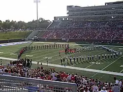 The SMU Mustang Band, known as "the Hub of SMU Spirit" or the "Best Dressed Band in the Land" because of its 32 unique uniforms,[1] is the marching band of Southern Methodist University. The band represents the University at football games, produces the Pigskin Revue during Homecoming, and performs at special university and community-related events.[2] Founded in 1917,[3] the Mustang Band is currently under the direction of Director Charles Aguillon, Assistant Director Paul Crockett, and Drumline Instructor Jon Lee.[4]