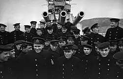 Molotov was laid down at the Marti South, Nikolayev on 14 January 1937, launched on 4 December 1939 and was completed on 14 June 1941. As the only ship in the Soviet Navy with radar, Molotov remained in Sevastopol for the initial period of Operation Barbarossa to provide air warning.[2] The advance of German troops into the Crimea in late October 1941 forced her to transfer to Tuapse where she continued to provide air warning.[2][8] However, the ship did bombard German troops near Feodosiya with nearly 200 180 mm shells on 9 November before returning to Tuapse. Molotov helped to carry the 386th Rifle Division from Poti to Sevastopol between 24 and 28 December 1941. While off-loading troops on 29 December her stern was damaged by German artillery and she shelled Axis positions in retaliation, firing 205 180 mm and 107 100 mm shells. The ship evacuated 600 wounded upon her departure on 30 December.[2]