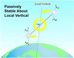 A non-rotating tether system has a stable orientation that is aligned along the local vertical (of the earth or other body). This can be understood by inspection of the figure on the right where two spacecraft at two different altitudes have been connected by a tether. Normally, each spacecraft would have a balance of gravitational (e.g. Fg1) and centrifugal (e.g. Fc1) forces, but when tied together by a tether, these values begin to change with respect to one another. This phenomenon occurs because, without the tether, the higher-altitude mass would travel slower than the lower mass. The system must move at a single speed, so the tether must therefore slow down the lower mass and speed up the upper one. The centrifugal force of the tethered upper body is increased, while that of the lower-altitude body is reduced. This results in the centrifugal force of the upper body and the gravitational force of the lower body being dominant. This difference in forces naturally aligns the system along the local vertical, as seen in the figure.[1]