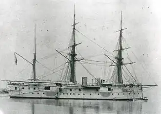 Designed for colonial service,[3] she had two funnels and was rigged as a barque.[4] Her machinery was manufactured by the John Penn Company of Greenwich, United Kingdom.[1] The original main battery of Armstrong-built 8-inch (203 mm) guns was obsolescent when she was completed, and were quickly replaced with more modern Hontoria-built 6.4-inch (163 mm) guns (a heavier main battery than that carried by her two sisters Castilla and Navarra), at least four of which were mounted in sponsons.[4]