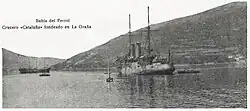 Cataluña operated against Rifian forces during the Rif War in Morocco of 1921–1926. In 1924 Rifian forces at M'Ter fired at her, and as she returned fire a gun exploded on her deck, killing one of her officers.[2] At the end of 1924 she entered dry dock at Matagorda, Spain, for careening.[2]