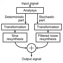 Spectral modeling synthesis (SMS) is an acoustic modeling approach for speech and other signals. SMS considers sounds as a combination of harmonic content and noise content. Harmonic components are identified based on peaks in the frequency spectrum of the signal, normally as found by the short-time Fourier transform. The signal that remains following removal of the spectral components, sometimes referred to as the residual, is then modeled as white noise passed through a time-varying filter. The output of the model, then, are the frequencies and levels of the detected harmonic components and the coefficients of the time-varying filter.