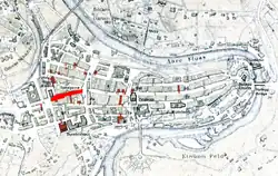 Shortly before 1228, the Holy Ghost hospital and abbey were founded outside the city walls of Bern. While the hospital name changed to Oberer Spital (Upper Hospital) in 1307, when the Niedern Spital (Lower Hospital) was founded in what would later become Gerechtigkeitsgasse 2–10, the abbey and chapel retained the original name.[1] As the city expanded it began to surround the hospital and abbey. Then, in the third expansion of the city from 1344 to 1346, the old Bümpliz road, which ran by the abbey, became part of the main road through Bern. In 1344 it was known as nüwe stat zem heiligen Geist for the abbey's name. However, by 1359 it was known as Spitalgasse after the Oberer Spital. Spitalgasse was an extension of the old Roman road from the east gate of Aventicum to Bümpliz[2] In 1715 the Oberer and Niedern Spital merged into the Grossen Spital (Grand Hospital). The buildings on Spitalgasse were demolished in 1726/31 after the new Burgerspital was built.