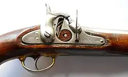 In 1793, the National Arsenal contained brass ordnance, howitzers, traveling carriages, shot strapt, canisters filled, quilted grape, iron shot, shells, powder, musket ball, cylinders, caps, paper cartridges, fuzes filled, muskets, swords, various military stores, and implements.[10] In 1795, the Springfield Armory produced the new nation's first musket - the Model 1795 Musket which was largely patterned after the French Charleville musket which had armed the French army during the American Revolution.