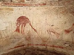 Inside the church there are some wall paintings, which include a two headed eagle and a horse with a female rider, who is believed to be Mamica Kastrioti.[5]