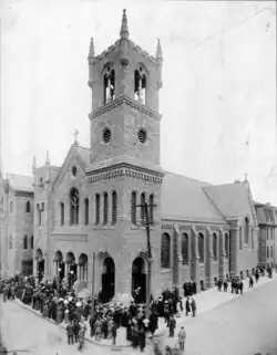 Father John J. Donnelly (1851-1927)[8] was appointed rector in 1889 and he found the location of the chapel "not sufficiently central for the parish."[4] The congregation had grown from 75 parishioners to 4,000, and settlement had moved west of the original chapel.[9] Rev. Donnelly purchased a lot on the northeast corner of Sixth and Tioga Streets and a new Norman-Romanesque chapel and school, of Trenton brownstone, was erected and dedicated on April 22, 1894. Three years later, a new rectory in the Second Empire style was completed.
