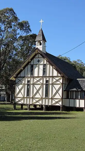 The church is a simple rectilinear form, with the chancel to eastern end and the porch to the south of the western end. The addition housing the vestry is to the south-east corner. The wall framing of studs, noggings and bracing is exposed to the exterior of the building, and purposefully arranged as a decorative element which is further emphasised by its contrasting colour. The wall cladding to the interior of the framing is pit-sawn planks of cypress pine, some 250 millimetres (9.8 in) wide, laid horizontally. The roof is steeply pitched with gable ends, and a timber bell-cote with spire at the western end. The roof is clad in hand-split hardwood shingles. The entry door from the south porch is a boarded and ledged door with a lancet head, and still furnishing its original bolt and rimlock. Inside, the nave has a special quality of light created by a continuous opening between the top of the walls and the roof framing, to the sides and the gable ends. The tall, narrow windows hand painted with a stipple pattern also contribute to this light. These windows have trefoil heads applied to the outside, giving them a Gothic-like shadow internally. They open by sliding along tracks to the inside of the wall. The floor is of wide raw cypress pine boards, which are hand-scrubbed clean to retain their bleached appearance. The exposed roof framing and trusses have been stained. All the major members are stop chamfered. The trusses feature twisted vertical tie rods. The chancel arch, also of lancet form, is lined with beaded board.[1]