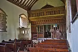 The church contains a remarkable medieval rood screen and rood loft, c. 1500, restored during Seddon's 19th-century reconstruction.[3] This has been described as "a breathtaking sight, rising almost to the roof"[6] and "one of the most spectacular rood screens" in the area.[7] It has been suggested that the village's remoteness saved the screen from destruction by the Puritans.[8] Newman writes that "the glory of the interior is the rood screen and loft",[2] which Cadw describes as "one of the finest in Britain" and of "exceptional richness and complexity".[1] It was heavily, but sympathetically, restored by Seddon. Of the same, latter, date, are the lectern, the font, the choir stalls, the pews and the tiling throughout the church, the whole representative of Seddon "at his most imaginative."[2]