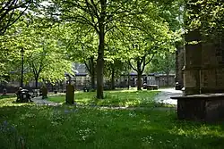 Part of the graveyard was built over in the 1960s for meeting rooms and a hall. As of 2010, there remained about ten gravestones. Two of these, that to Solomon Hodgson (died 1800)[6] and Sarah Hodgson, owners of the Newcastle Chronicle, and that to the artist Ralph Waters[7] are listed Grade II.