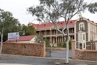 The foundation stone for St Joseph's Convent was laid by Bishop Dunne in February 1891. Adelaide architect E. J. Woods designed the building, and local contractor Mr. Kelly was responsible for construction of the initial west wing.[6] The first stage of the current building officially opened on 19 July 1891, although it was originally viewed as the "new wing" in conjunction with the original cottage, with further development planned as the growth of the town warranted it. The building would subsequently be completed in three separate contracts, the last c. 1907–08, with the original cottage demolished to make way for newer buildings in the 1950s to house the music rooms and Nun's Infirmary. The total cost of construction amounted to "just on £16,000".[7][8]