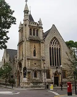 The construction of the church building originated in a suggestion made by the minister of the Regent Square church to the Reverend Gavin Carlyle, a nephew of Edward Irving, that Carlyle should travel from Edinburgh to preach in London.[2] Tenders for the construction were accepted in July 1862, and in December the trustees accepted a 99-year lease at the site.[3] The architect, J. M. McCulloch, and the builders, R. and A. M. Greig, quoted a price of £3,368, but costs eventually rose to £6,000 as the church was opened in May 1863.[4]