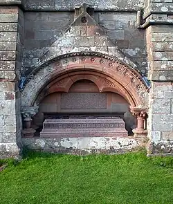 The vestry and transept house the Vernon Chapel which has a transept gable end and a central pointed doorway with nookshafts and an outer dog-tooth and an inner rosette moulding. Above is a three-light window with hood mould and foliated stops. The adjacent gable end has at its base a gabled monument to Thomas Bowater Vernon (died 1859). Above is a rose window with a hood mould returning to form a string. The east-side elevation has a dog-tooth eaves moulding and a three light window.[2]