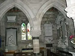 There are numerous memorials including, in the Vernon Chapel, a large monument to Thomas Vernon (died 1721) by Stanton and Horsnaile. It has a semi-reclining effigy flanked by the figures of Justice and Learning and behind this, Corinthian columns supporting an open pediment. There is also a standing monument of Bowater Vernon (died 1835) by Roubiliac, a large marble relief panel by Chantrey to Thomas Taylor Vernon (died 1837) and a late 17th-century memorial to Richard Vernon (died 1678).[2]