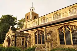 The 1543 building has undergone many alterations and enlargements during its long history and, of the original Tudor church, only the tower remains.[5] The belfry and the cupola are a distinctive feature of the tower which appears as a landmark in many historic prints and pictures of the Thames bank. The current appearance of the church is mostly the work of local architect Sir Arthur Blomfield, who built the chancel in 1885; his firm built the nave in 1905.[6]