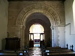 The nave is of three bays, and incorporates flintwork from the original 10th-century church, a blocked Saxon doorway on the north side and another on the south side dating from the 12th-century reconstruction. The two-bay chancel is in the Early English style; its east window has an example of reticulated (grid-pattern) tracery.[4] The Norman tower has three arches on each face—the central one open and slightly larger, flanked by two closed arches—below paired oeils-de-boeuf.[4][8] Inside, the large crossing and tower arches dominate. Each arch features well-preserved Norman carving, as do the arches of the transepts: as well as the royal figures, the cat and the elf, there are other human faces, shells, rosettes and chevron patterns.[3][4][8][12]