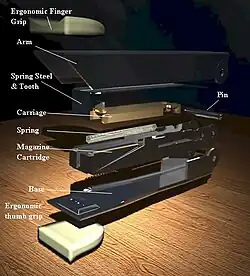 A stapler is a mechanical device that joins pages of paper or similar material by driving a thin metal staple through the sheets and folding the ends. Staplers are widely used in government, business, offices, workplaces, homes, and schools.[1]