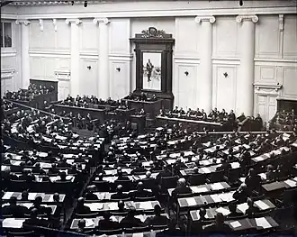 The State Duma, also known as the Imperial Duma, was the lower house of the legislature in the Russian Empire, while the upper house was the State Council. It held its meetings in the Tauride Palace in Saint Petersburg. It convened four times between 27 April 1906 and the collapse of the empire in February 1917. The first and the second dumas were more democratic and represented a greater number of nationalities and groups than their successors.[1] The third duma was dominated by gentry, landowners, and businessmen. The fourth duma held five sessions; it existed until 2 March 1917, and was formally dissolved on 6 October 1917.